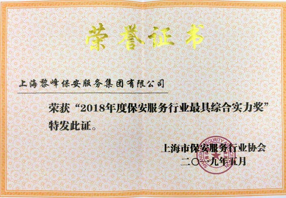 2018年10月 榮獲上海市公安局頒發的“保安服務行業綜合實力企業獎”